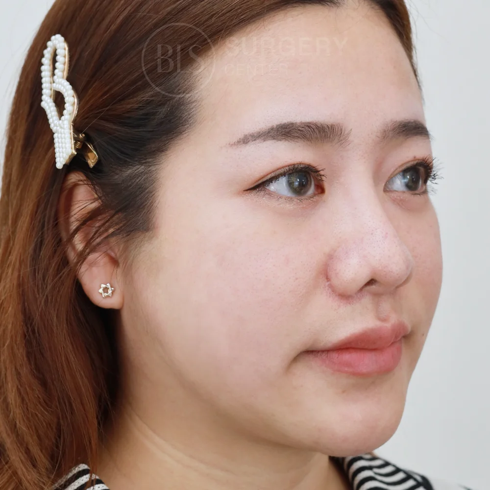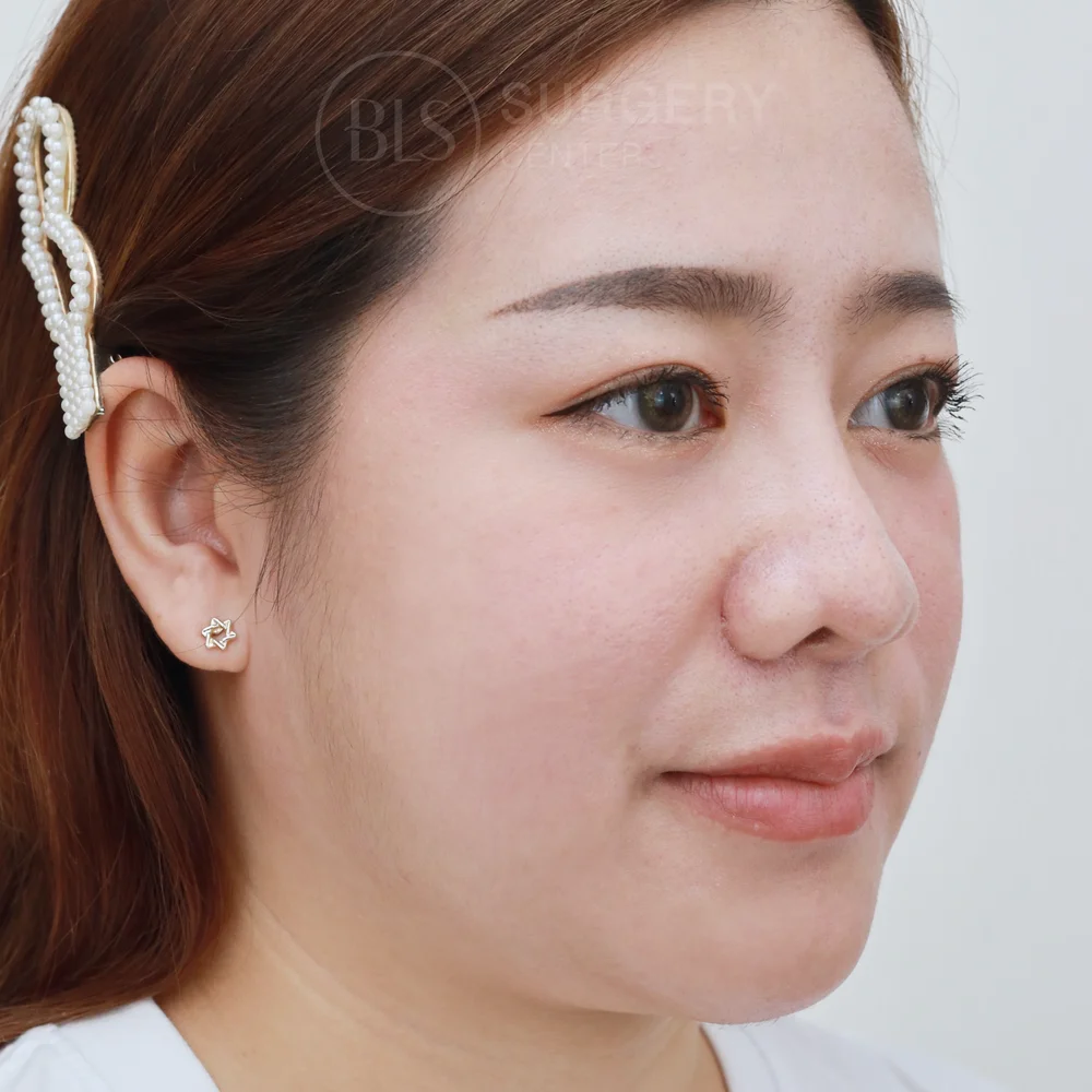เคสนี้มีปัญหาผิวหย่อนคล้อย จากไขมันบริเวณใบหน้าส่วนบนฝ่อตัวลงตามวัย ทำให้ไขมันย้อยลงไปอยู่บริเวณใบหน้าส่วนล่าง จึงเกิดร่องแก้มลึก เริ่มมองเห็นร่องน้ำหมากได้ชัด และยังทำให้หน้าไม่ได้สัดส่วน หมอประเมินดูแล้ว แนะนำคนไข้ทำหัตถการร้อยไหม (Thread Lift) โดยใช้ไหมมิ้นท์ Mint Lift รุ่น Fine ใช้ในการดึงยกบริเวณหน้าแก้มขึ้น แก้ปัญหาไขมันที่ฝ่อตัวและตกลงด้านล่าง ช่วยลดความหย่อนคล้อยบริเวณแก้ม แก้ปัญหาร่องแก้มลึก ร่องน้ำหมากชัด ช่วยให้หน้าดูเด็กลง และดูสดใสขึ้น