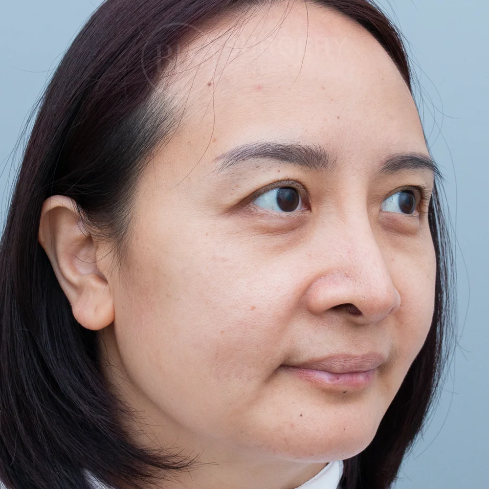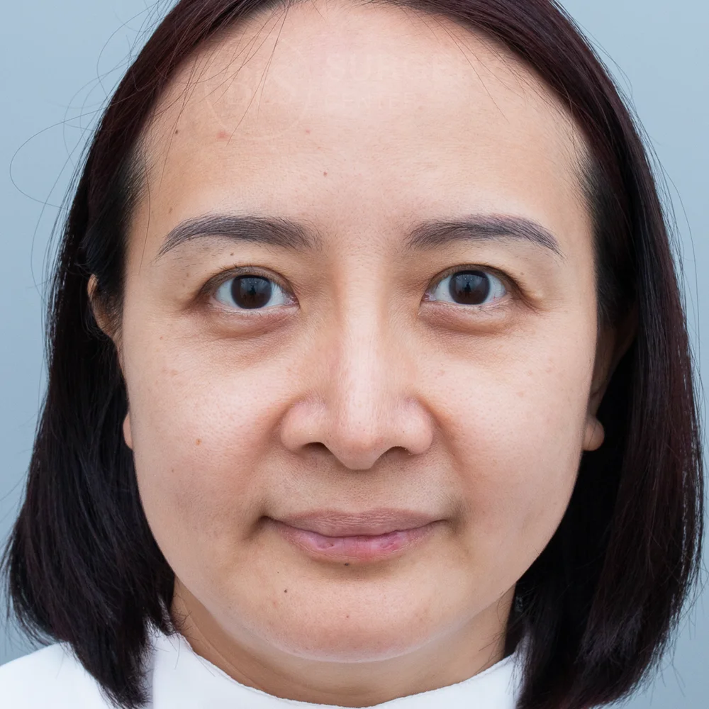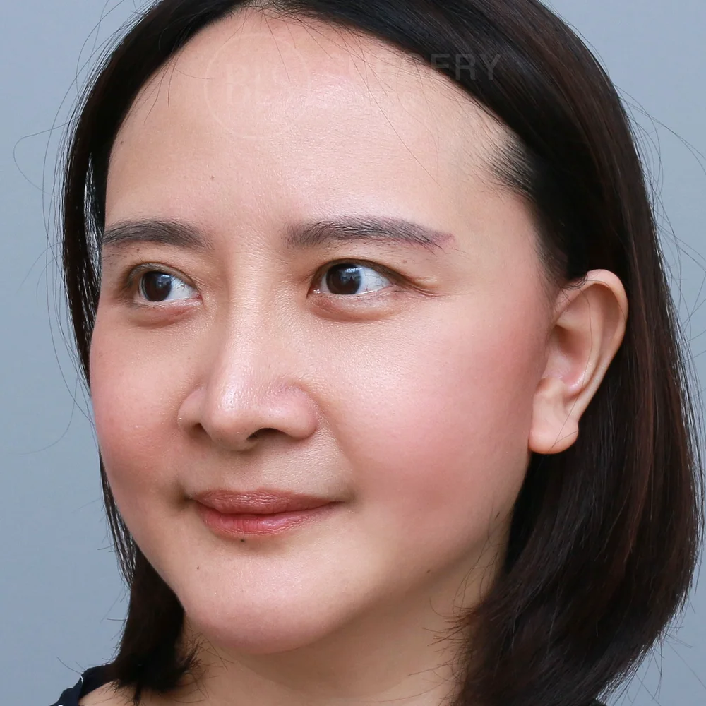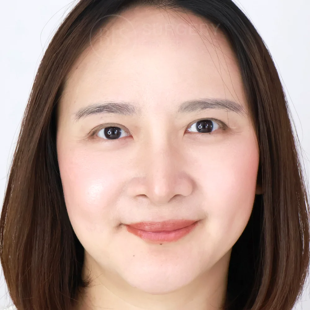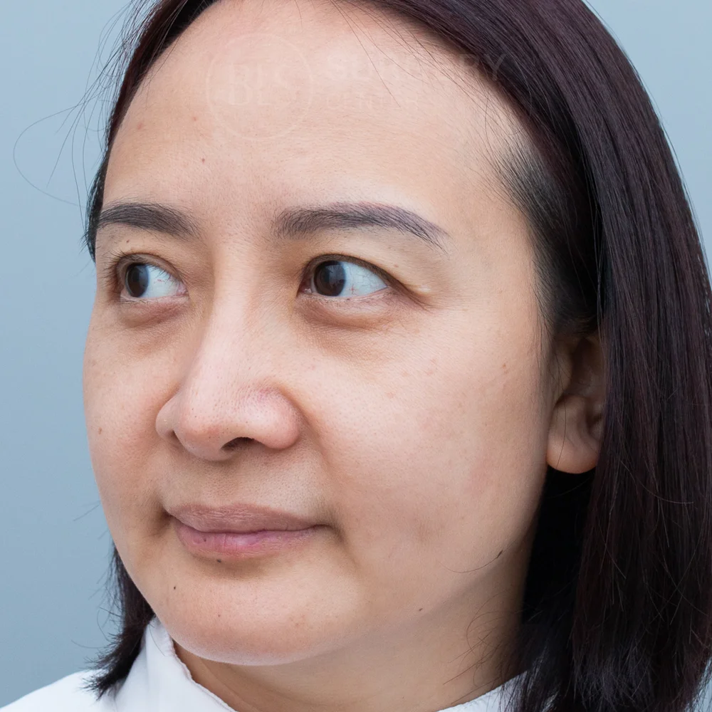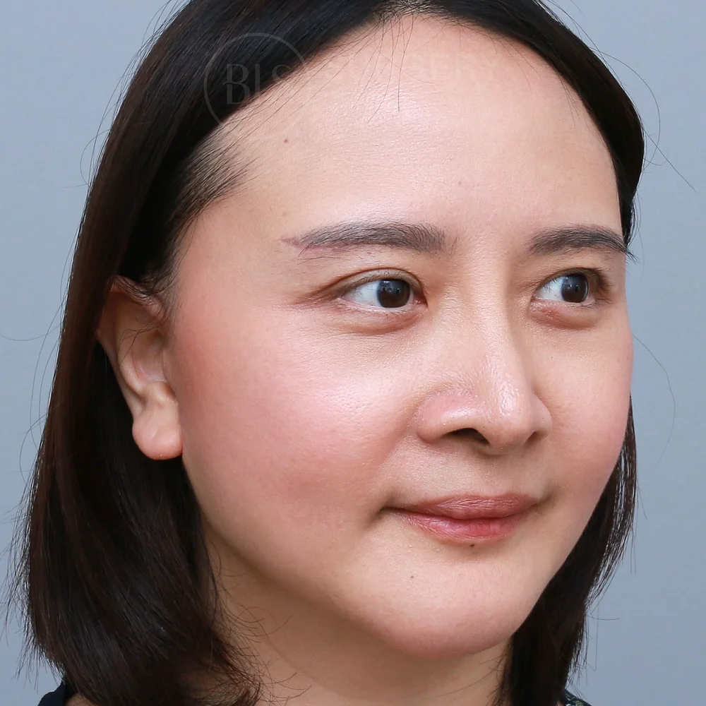 ก่อนทำ คนไข้มาด้วยปัญหา ใบหน้าหย่อนคล้อย ไม่เรียบกระชับ มีร่องแก้มลึก แก้มห้อยจนสังเกตได้ ซึ่งทำให้หน้าดูมีอายุเกินจริง และรูปทรงคางที่ดูมีลักษณะคางตัด ทำให้รูปหน้าดูกลม คางสั้น หน้าไม่เรียว เลยเข้ามาปรึกษาหมอที่ BLS Surgery Center เพื่อให้หมอแก้ปัญหาเหล่านี้ หมอประเมินปัญหาพบว่าผิวหน้ามีความหย่อนคล้อย ร่วมกับมีทรงคางที่ค่อนข้างมน ทำให้ใบหน้าโดยรวมดูสั้น หน้าดูกลม และไม่ได้สัดส่วนเท่าที่ควร หมอจึงแนะนำการศัลยกรรมดึงหน้า (Facelift) และเสริมคาง (Chin Augmentation) หลังทำ ช่วยให้คนไข้มีใบหน้าที่ดูเด็กลง แก้มยกกระชับ ลดร่องแก้ม และได้รูปหน้าที่เรียว ดูเป๊ะมากยิ่งขึ้น ช่วยแก้ไขผิวหย่อนคล้อย ด้วยเทคนิคซ่อนรอยแผลเนียน (Invisible Lock) ทำให้ผิวกลับมากระชับเต่งตึงอย่างเป็นธรรมชาติ ไม่ต้องพักฟื้นนาน